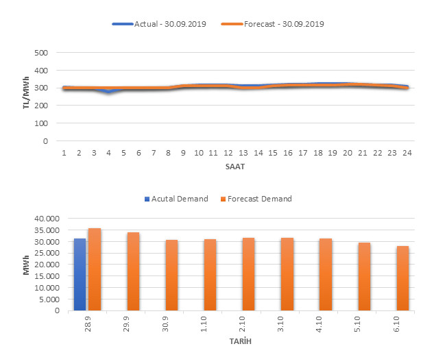 Tahminleme Modeli* analizi sonucu ortalama piyasa takas fiyatı 309.31 TL/MWh ve ortalama tüketim 30,694 MWh olarak öngörülmektedir. Modelin piyasa takas fiyatına dair başarı oranı günlük % 87, tüketime dair başarı oranı** ise günlük % 86 olarak hesaplanırken, bugüne kadar yapılan piyasa takas fiyatına dair analizlere göre başarı oranı % 91, tüketime dair başarı oranı ise % 94 olarak hesaplanmaktadır. Saatlik yarın için oluşan ve tahmin edilen piyasa takas fiyatları ile haftalık bazda tahmin edilen ve gerçekleştikçe yer alacak günlük ortalama tüketim değerleri aşağıdaki grafiklerde yer almaktadır.