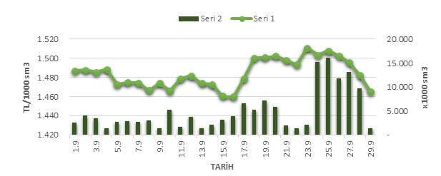 Organize Toptan Doğal Gaz Satış Piyasası (OTSP) dahilinde 01.09.2019 – 29.09.2019 tarihleri arası ortalama Gaz Referans Fiyatı (GRF) 1,484.3 TL/1000 sm3 olarak belirlenirken, aynı tarihler arasında toplam gerçekleşen eşleşmelerin miktarı ise 143,037 x1000 sm3 olarak belirlendi. İlgili tarihler arasında günlük Gaz Referans Fiyatı (GRF) ile Eşleşme Miktarı verileri aşağıdaki grafikte yer almaktadır.