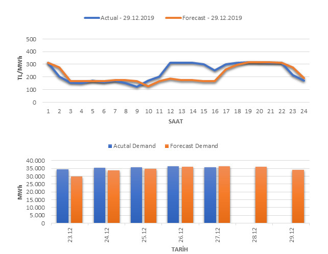 Tahminleme Modeli* analizi sonucu ortalama piyasa takas fiyatı 254.64 TL/MWh ve ortalama tüketim 32,907 MWh olarak öngörülmektedir. Modelin piyasa takas fiyatına dair başarı oranı günlük % 90, tüketime dair başarı oranı** ise günlük % 95 olarak hesaplanırken, bugüne kadar yapılan piyasa takas fiyatına dair analizlere göre başarı oranı % 91, tüketime dair başarı oranı ise % 94 olarak hesaplanmaktadır. Saatlik yarın için oluşan ve tahmin edilen piyasa takas fiyatları ile haftalık bazda tahmin edilen ve gerçekleştikçe yer alacak günlük ortalama tüketim değerleri aşağıdaki grafiklerde yer almaktadır.