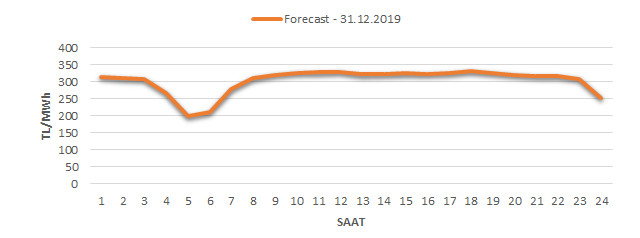 Yarından sonraki gün için oluşacak ortalama piyasa takas fiyatı 305.81 TL/MWH olarak tahmin edilmektedir. Buna bağlı olarak günün maksimum fiyatı 333.27 TL/MWh olarak 17:00 – 18:00 saat aralığında, minimum fiyatı 200.01 TL/MWh olarak 04:00 – 05:00 saat aralığında gerçekleşeceği öngörülmektedir. Puant saatlerde (17:00 – 22:00) tahmini ortalama piyasa takas fiyatı ise 322.2 TL/MWh olarak hesaplanabilmektedir. Saatlik oluşacak piyasa takas fiyatı tahminleri aşağıdaki grafikte yer almaktadır.