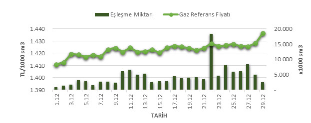 Organize Toptan Doğal Gaz Satış Piyasası (OTSP) dahilinde 01.12.2019 – 29.12.2019 tarihleri arası ortalama Gaz Referans Fiyatı (GRF) 1,422.9 TL/1000 sm3 olarak belirlenirken, aynı tarihler arasında toplam gerçekleşen eşleşmelerin miktarı ise 129,653 x1000 sm3 olarak belirlendi. İlgili tarihler arasında günlük Gaz Referans Fiyatı (GRF) ile Eşleşme Miktarı verileri aşağıdaki grafikte yer almaktadır.