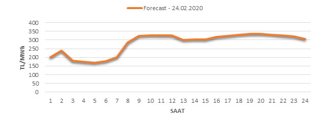 Yarından sonraki gün için oluşacak ortalama piyasa takas fiyatı 281.39 TL/MWH olarak tahmin edilmektedir. Buna bağlı olarak günün maksimum fiyatı 335.07 TL/MWh olarak 19:0020:00 saat aralığında, minimum fiyatı 169.5 TL/MWh olarak 04:0005:00 saat aralığında gerçekleşeceği öngörülmektedir. Puant saatlerde (17:0022:00) tahmini ortalama piyasa takas fiyatı ise 329.14 TL/MWh olarak hesaplanabilmektedir. Saatlik oluşacak piyasa takas fiyatı tahminleri aşağıdaki grafikte yer almaktadır.