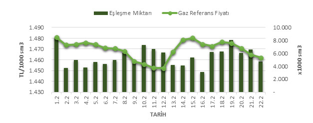 Organize Toptan Doğal Gaz Satış Piyasası (OTSP) dahilinde 01.01.202022.02.2020 tarihleri arası ortalama Gaz Referans Fiyatı (GRF) 1,469.57 TL/1000 sm3 olarak belirlenirken, aynı tarihler arasında toplam gerçekleşen eşleşmelerin miktarı ise 120,163 x1000 sm3 olarak belirlendi. İlgili tarihler arasında günlük Gaz Referans Fiyatı (GRF) ile Eşleşme Miktarı verileri aşağıdaki grafikte yer almaktadır.