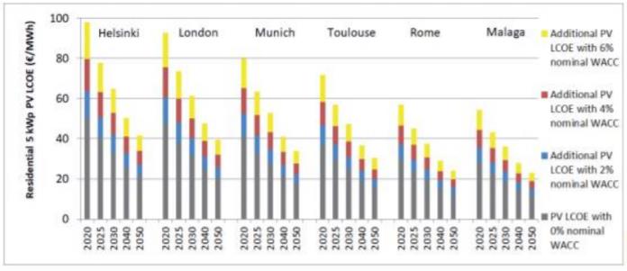 5 kWp konut-çatı FV için farklı nominal WACC’lere sahip 6 Avrupa lokasyonunda PV LCOE