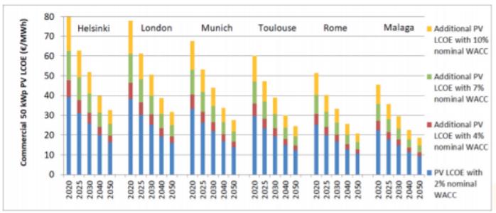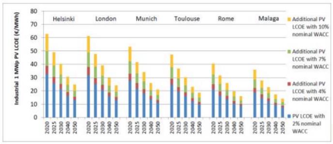Avrupa Fotovoltaik Teknoloji ve İnovasyon Platformu‘nun (ETIP FV) temel senaryosuna göre, toplam küresel FV kapasitesi 2019 yılı sonu olan 0.634 TWp‘den 2030’da yaklaşık 3 TWp‘ye ve 2050‘de 20 TWp‘ye yükselecektir. Bu artış, % 25 LR ve ortalama %0,4‘lük yıllık ortalama verimlilik artışı, FV LCOE 2020‘den 2030‘a kadar yaklaşık %35 ve 2050‘ye kadar yaklaşık % 60 azalacaktır. Şekil 1-4, Avrupa 6 farklı yerindeki, 4 farklı sistem boyutu ve farklı nominal Ağırlıklı Ortalama Sermaye Maliyetleri (WACC) oranları ile FV LCOE‘yi göstermektedir.