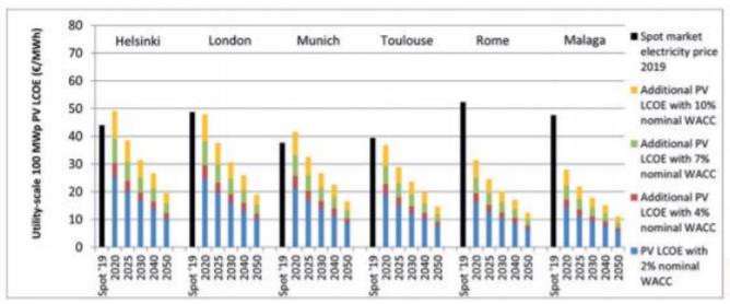 4’üncü grafikten de anlaşılacağı gibi 2019’daki ortalama toptan satış (spot piyasa) elektrik fiyatları ile karşılaştırıldığında, kamu hizmeti ölçeğinde FV, Almanya ve Finlandiya’da %7‘nin üzerinde nominal WACC ve diğer dört ülkede %10‘un üzerinde WACC ile zaten rekabet halindeydi. Malaga‘da,% 7 nominal WACC’ye sahip şebeke ölçeğindeki PV LCOE şu anda 22 € / MWh‘dir ve 2030‘da 14 € / MWh‘ye ve 2050‘de 9 € / MWh‘ye düşmektedir. Dünyanın çeşitli ülkelerinde, enerji satın alma anlaşmaları (PPA’lar) 15 € / MWh‘nin altında imzalanmış olup, makul bir faiz oranı gerçekten düşük teknolojik ve çevresel riski yansıtıyorsa, PV‘nin halihazırda en ucuz elektrik formu olduğunu kanıtlamaktadır.