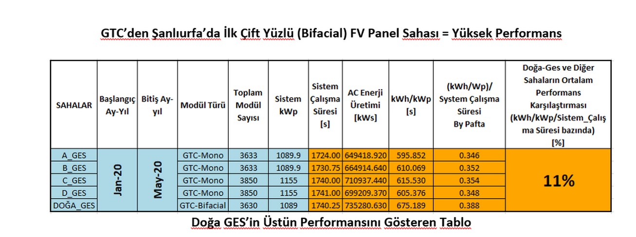 GTC’nin yaptığı açıklamaya göre, Doğa GES’in aynı bölgede bulunan ve tek yüzlü panellerle kurulmuş olan sahalarla kıyaslandığında, ortalama % 11 daha iyi performans gösterdiği kanıtlandı.