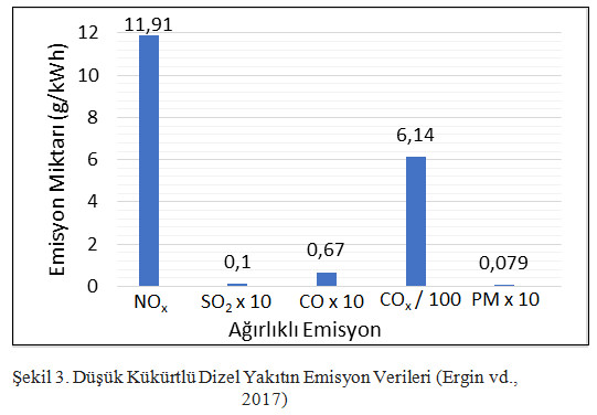 İstanbul Teknik Üniversitesi tarafından 2017 yılında yapmış olduğu deneyde, ABC 8MDX tipi, 4 motorlu, turbo şarjlı, dahili soğutma, 883 kW motor gücü, 198 g/kWh yakıt tüketimi ile 850 devir/dakika motor hızı olan gemide yakıt olarak düşük kükürtlü içeren dizel yakıt kullanılmıştır. Emisyon verileri değerlendirilmiştir (Şekil3).