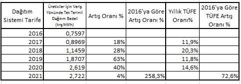 1 Ocak 2021‘den itibaren uygulanmaya başlanan İletim Sistem Kullanım ve Sistem İşletim Tarifesi ile EPDK tarafından onaylanan “Üreticiler İçin Dağıtım Tarifesi” artış oranları tepkileri üzerine çekiyor. Açıklanan artış oranlarının, yıllık %14,6 olan enflasyon oranının çok üzerinde olduğu ve bu durumun elektrik üreticileri için oldukça zorlayıcı olacağı şimdiden fark ediliyor.