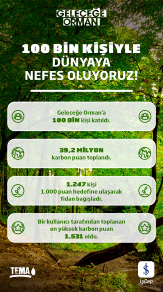 Türkiye İş Bankası’nın sürdürülebilir bir gelecek hedefi kapsamında hayata geçirdiği “Geleceğe Orman” uygulaması, 100.000 katılımcıya ulaştı. İş Bankası da bugüne kadar uygulama kapsamında kullanıcılar tarafından TEMA Vakfı’na bağışlanan fidanlara ek olarak 1.250 fidan bağışında bulundu.