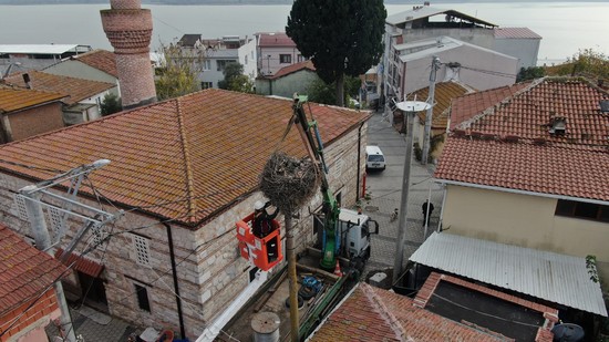 Güney Marmara’da elektrik dağıtım hizmeti veren Uludağ Elektrik yıllar önce bir leyleğin yuva yaptığı elektrik direği eskiyince yenisini yaparak yuvayı zarar vermeden taşıdı.