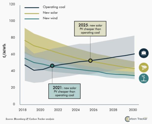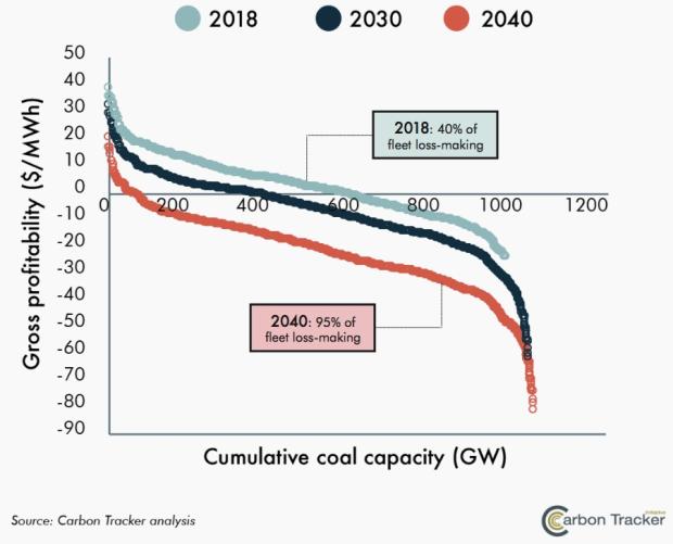 Carbon Tracker found that China’s coal fleet was essentially producing power for less than half the time it could have been generating energy. In industry terms, its utilization rate was below 50 percent. That’s partly because China has other means to generate power and partly because the country is looking to cut air pollution. It’s a major underuse of very expensive assets. Projections for coming years are trickier. Carbon Tracker assumes China will levy some form of carbon pricing, starting in 2021 at $5 per metric ton of carbon dioxide emissions and rising to about $40 by 2040. That will add to the operating expenses of coal power plants, and eat into potential profits. Based on those same carbon price predictions, it will be inexpensive to build brand new wind and solar farms in China than to operate an existing coal power plant in 2021 and 2025, respectively, according to Carbon Tracker.