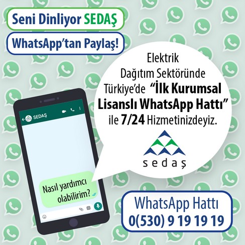 SEDAŞ aboneleri, 186 SEDAŞ çağrı merkezi ile 0530 919 19 19 telefon numaralı Whatsapp Hattı’ndan 7/24 tüm bildirim, görüş, öneri ve isteklerini iletebiliyorlar.