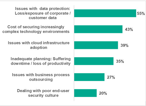 Kaspersky’nin BT sektörünün karar vericileri arasında yaptığı küresel araştırma, bir veri ihlali nedeniyle kurumsal ve müşteri bilgilerinin kaybolması veya açığa çıkmasının şirketler için büyük bir baş ağrısı olduğunu gösteriyor, öyle ki her büyüklükteki kuruluştan katılımcıların %55‘i bu konuyu BT güvenliğiyle ilgili en zorlayıcı detay olarak belirtiyor. Diğer yaygın endişeler arasında giderek karmaşıklaşan teknoloji ortamlarıyla beraber yükselişe geçen güvenlik maliyetleri ve bulut altyapısının benimsenmesiyle ilgili sorunlar var ki bunlar da sırasıyla %43 ve %39’lik paylarla yer alıyor.