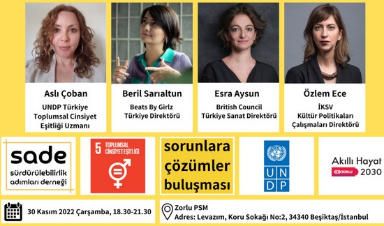 Sürdürülebilir Kalkınma Amaçları özelinde yapılan ilham verici çalışmaları ve iyi uygulama örneklerini dinlemek, karşılıklı fikir ve deneyim paylaşımında bulunmak amacıyla düzenlenen Sorunlara Çözümler Buluşması, 30 Kasım 2022 Çarşamba günü 18:30-21:30 saatleri arasında “Amaç 5: Toplumsal Cinsiyet Eşitliği” odağında gerçekleştirilecek. Sosyal girişimcileri, akademisyenleri, sivil toplum kuruluşlarını, özel sektörü ve kamu kurumlarını bir araya getiren etkinlikte, toplumsal cinsiyet eşitliği sanat odağında ele alınacak.