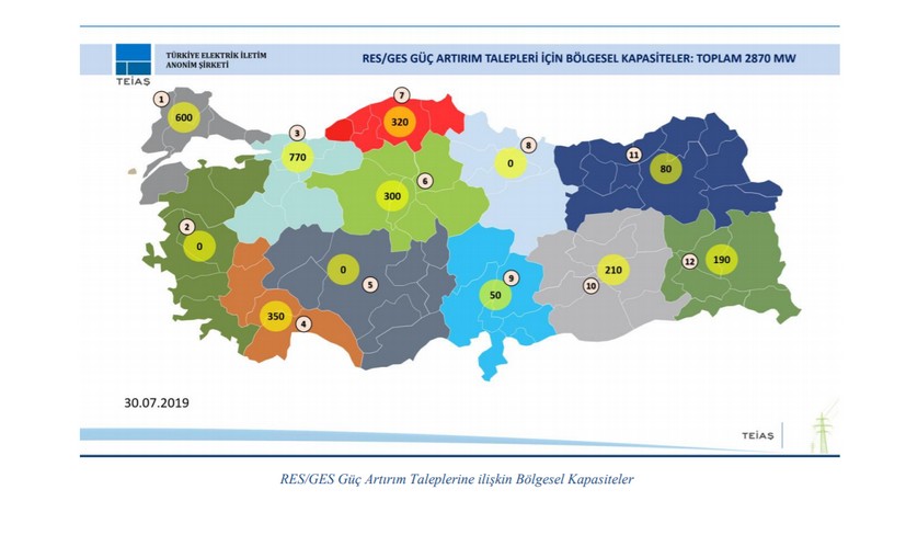 Türkiye Elektrik İletim A.Ş. (TEİAŞ) Genel Müdürlüğü tarafından rüzgar ve güneş enerjisi santrallerine yönelik yapılan elektriksel kapasite artırım başvuruları için 12 farklı bölgede 2.870 MW’lık ek kapasite tahsis edilebileceği açıklandı.