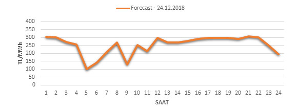 The average market clearing price for the day after tomorrow is estimated as 253.21 TL / MWH. Accordingly, the maximum price of the day is 306.8 TL / MWh between 20:00 – 21:00 hours, the minimum price is expected to be 99.73 TL / MWh between 04:00 – 05:00 hours. The estimated average market clearance price at peak hours (17:00 – 22:00) can be calculated as 290.35 TL / MWh. Market swap price estimates for hourly are given in the chart below.