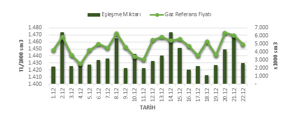 While the average Gas Reference Price (GRF) between 01.12.2018 and 22.12.2018 was determined as 1,454.07 TL / 1000 sm3 in the Organized Wholesale Natural Gas Sales Market (OTSP), the total amount of matched matches between the same dates was determined as 72,820 x1000 sm3. The daily Gas Reference Price (GRF) and Match Quantity data are included in the chart below.