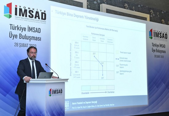 Türkiye İMSAD Üye Buluşması’nın konuk konuşmacısı Türkiye Deprem Vakfı Yönetim Kurulu Başkanı Prof. Dr. Alper İlki, gerçekleştirdiği sunumda Türkiye’de yaşanan depremlerin bölgede yol açtığı hasarlara ve bina özelliklerine ilişkin değerlendirmelerde bulundu. Depremin ilk günlerinde kalabalık bir ekip ve çeşitli kurum temsilcileri ile birlikte bölgede depremin sebep olduğu hasar konusunda incelemeler yaptıklarını söyleyen Prof. Dr. Alper İlki; izlenimlerinin kabaca tasarım hatası, yanlış malzeme, yanlış uygulama ve yanlış zemin seçimine bağlı olduğunu belirtti. Depremin büyüklüğünün yıkım açısından Anadolu tarihinin gördüğü en yüksek seviyede olduğunu ifade etti. Gündemdeki İstanbul depreminin olası senaryolarına ilişkin verileri de aktaran Prof. Dr. Alper İlki, 2000 yılı öncesi yapılan ve depremde can kaybına yol açabilecek binalar için yeniden yapım ve güçlendirme seçeneklerinin değerlendirilmesi gerektiğini belirtti. İstanbul’daki tespit çalışmaları neticesinde karşılaşılacak sonuçlara göre ortaya çıkacak olan yıkım, yeniden yapım ve güçlendirme seçenekleri hakkında değerlendirmelerde bulundu.