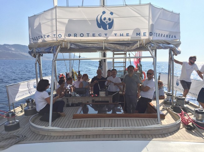 Toplantıdan sonra WWF’in Blue Panda yelkenlisi ziyaret edildi; Akdeniz’de plastik kirliliğine dikkat çekmek amacıyla bir saha gezisi yapıldı.