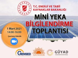 Türkiye güneş enerjisi sektörünün derneklerinden GENSED, GÜNDER ve GÜYAD, 1 Mart 2021’de Enerji Bakanlığı Yetkilileri’nin katılımı ile “Bilgilendirme Toplantısı” düzenleyeceklerini duyurdu: Değerli Üyemiz / Sektör Paydaşları, 01...