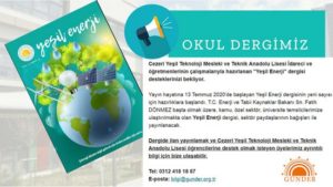GÜNDER, Cezeri Yeşil Teknoloji Mesleki ve Teknik Anadolu Lisesi İdareci ve öğretmenlerinin çalışmalarıyla hazırlanan “Yeşil Enerji” dergisi için duyuru paylaştı. GÜNDER’den yapılan açıklama ise şöyledir: Yayın hayatına 13 Temmuz...