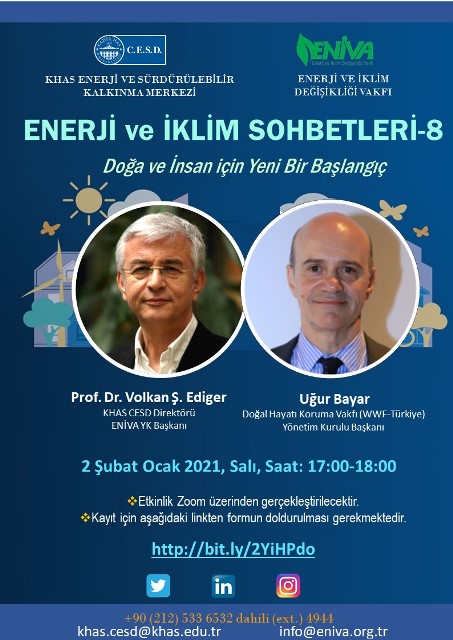Kadir Has Üniversitesi Enerji ve Sürdürülebilir Kalkınma Merkezi (CESD) ile Enerji ve İklim Değişikliği Vakfı (ENİVA) tarafından düzenlenen Enerji ve İklim Sohbetleri-8, 02 Şubat 2021 Salı günü saat 17.00-18.00 arasında düzenleniyor.