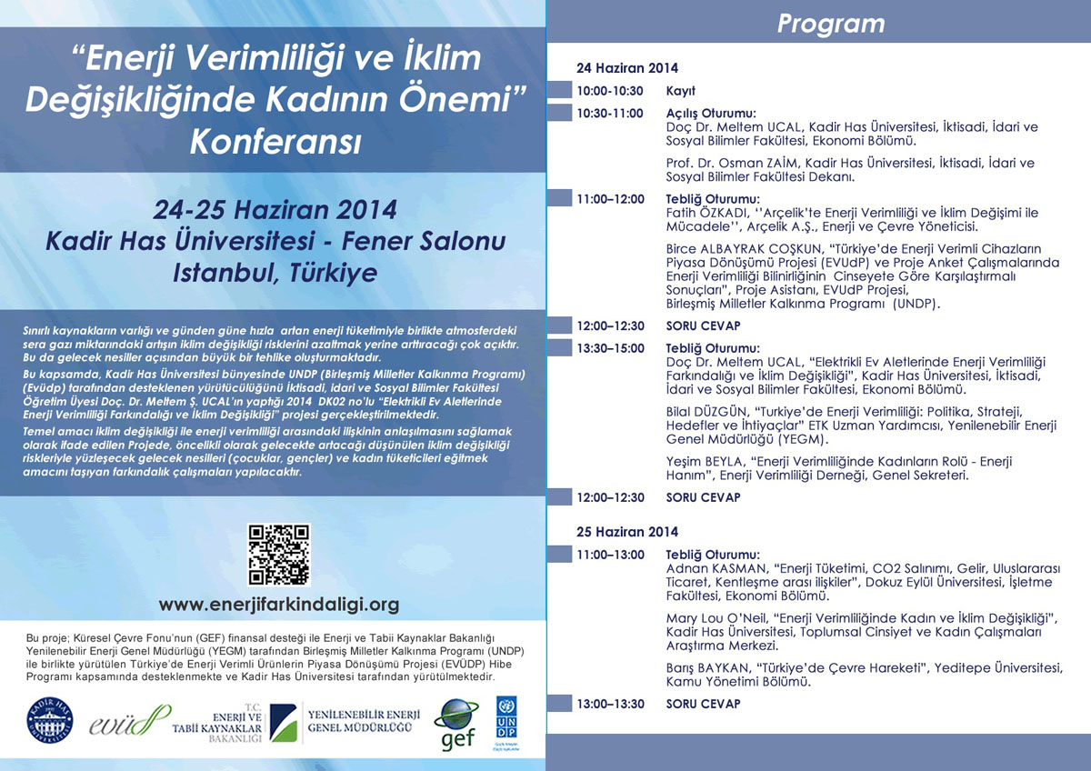 Kadir Has Üniversitesi, İktisadi, İdari ve Sosyal Bilimler Fakültesi Dekanı Prof. Dr. Osman Zaim’in ve Kadir Has Üniversitesi, İktisadi İdari ve Sosyal Bilimler Fakültesi öğretim üyesi Doç. Dr. Meltem Ucal’ın açılış konuşmalarını gerçekleştireceği konferansta, Arçelik Enerji ve Çevre Yöneticisi Fatih Özkadı “Arçelik’te Enerji Verimliliği ve İklim Değişimi ile Mücadele”, Yenilenebilir Enerji Genel Müdürlüğü’nden ETK Uzman Yardımcısı Bilal Düzgün ‘Türkiye’de Enerji Verimliliği: Politika, Strateji, Hedefler ve İhtiyaçlar’, Kadir Has Üniversitesi Toplumsal Cinsiyet ve Kadın Çalışmaları Araştırma Merkezi’nden Mary Lou O’Neil ‘Enerji Verimliliğinde Kadın ve İklim Değişikliği’, Enerji Verimliliği Derneği Genel Sekreteri Yeşim Beyla da “Enerji Verimliliğinde Kadınların Rolü-Enerji Hanım’ başlıklı sunumlarını gerçekleştirecek.