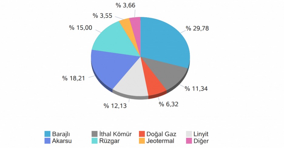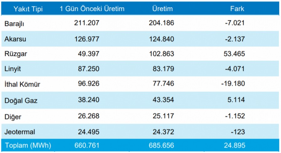 Günlük elektrik üretiminde en fazla katkı sağlayan ilk 3 enerji kaynağı sırasıyla %29,78 barajlı, %18,21 akarsu ve %15 rüzgar oldu. Bir gün öncesine göre; linyitten üretim miktarı ithal kömürde 19.180 MWh, azaldı, rüzgarda ise 53.465 MWh artış gösterdi.