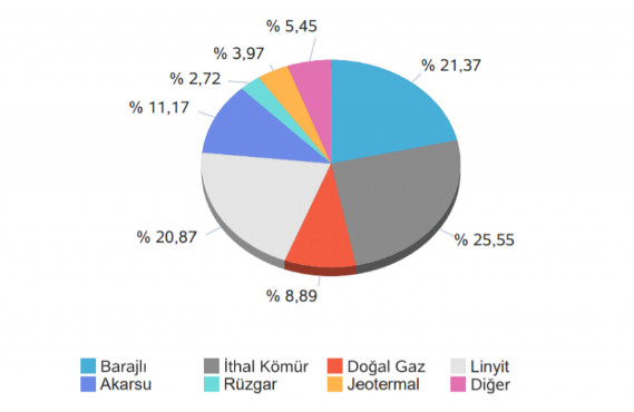 Günlük elektrik üretiminde en fazla katkı sağlayan ilk 3 enerji kaynağı sırasıyla ilk üç enerji kaynağı ilk üç enerji kaynağı sırasıyla %25,55 ithal kömür, %21,37 barajlı ve %20,87 doğal gaz oldu.