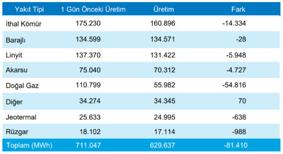Bir önceki güne göre; üretim miktarı doğal gazdan 54.816 MWh azalırken diğer kaynaklarda ise 70 MWh artış gösterdi.