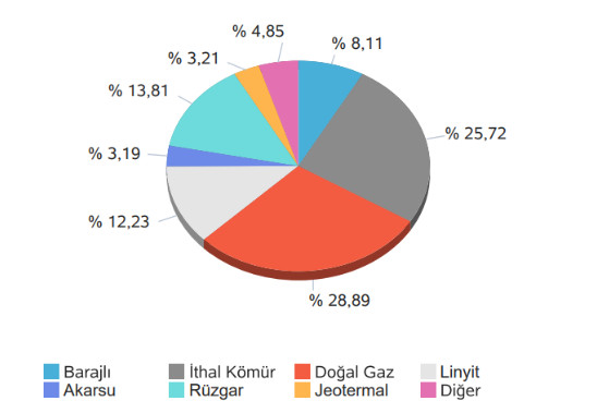 Günlük elektrik üretiminde en fazla katkı sağlayan ilk üç enerji kaynağı sırasıyla %28,89 doğal gaz, %25,72 ithal kömür ve %12,23 linyit olmuştur.