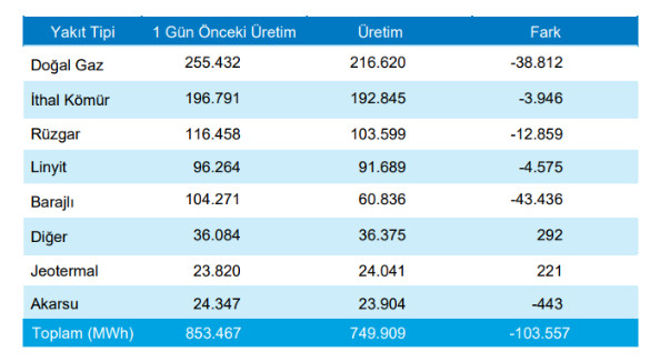 Bir önceki güne göre; üretim miktarı barajlıdan 43.436 MWh azaldı, diğerden 292 MWh artış kaydetti.