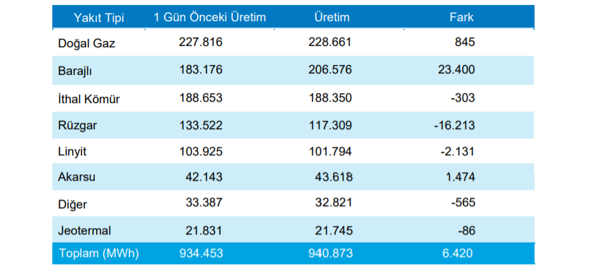 Bir önceki güne göre; enerji üretim miktarı rüzgar enerjisinden 16.213 MWh azalırken barajlıda ise 23.400 MWh artış gösterdi.