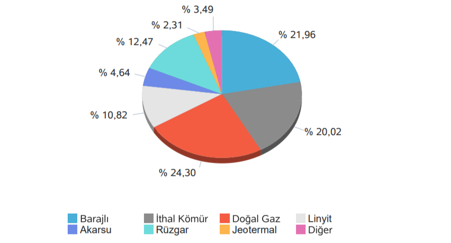 Günlük elektrik üretiminde en fazla katkı sağlayan ilk üç enerji kaynağı sırasıyla %24,3 doğal gaz, %21,96 barajlı ve %20,02 ithal kömür oldu.