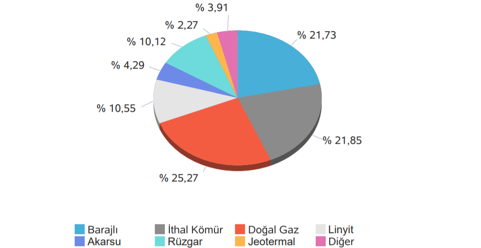 Günlük elektrik üretiminde en fazla katkı sağlayan ilk üç enerji kaynağı sırası ile %25,27 doğal gaz, %21,85 ithal kömür ve %21,73 barajlıdan olmuştur.