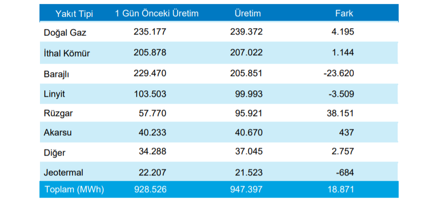 Bir önceki güne göre; üretim miktarı barajlıda 23.620 MWh azalırken rüzgarda ise 38.151 MWh artış gösterdi.