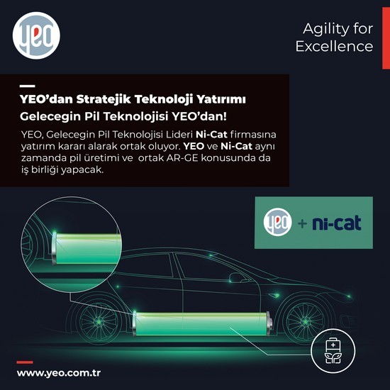 Altyapıları ve endüstrileri yenilenebilir enerji, elektrifikasyon ve otomasyonla buluştururken; sunduğu dijital teknolojilerle de karbon emisyonunun azaltılmasına katkı sağlayan ve kendi faaliyet alanlarında öncü olan YEO ve Ni-Cat ortaklığı ile, batarya teknolojileri sunmanın yanı sıra, pil üretimine yönelik araştırma ve geliştirme faaliyetleri de birlikte yürütülecek.