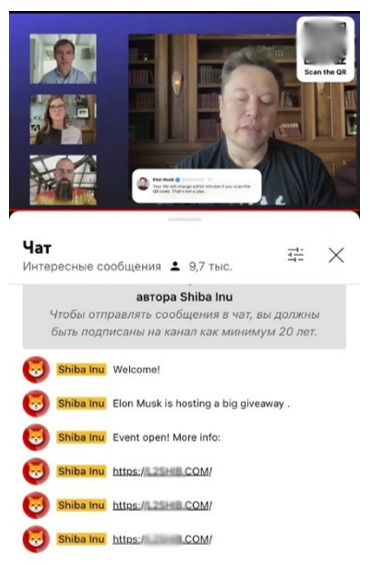 Kripto para birimlerini konu alan, Elon Musk ile halihazırda var olan yayını istismar eden bu türden videolar, izleyicileri ekranda gösterilen QR kodunu takip etmeye ikna etmek için kullanılıyor. Karekodun arkasındaki bağlantı, kripto para çekilişine ev sahipliği yaptığını iddia eden ancak kullanıcıların parasını ve kişisel verilerini riske atan bir dolandırıcılık girişimine yönlendirme yapıyor.