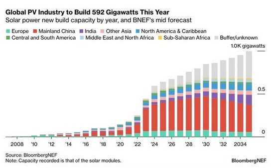 Raporda, güneş paneli kurulumlarında önümüzdeki yıllarda istikrarlı artış olacağı ve 2035’e kadar yıllık 996 GW kurulum seviyesine ulaşılacağı öngörülüyor. Çin‘in güneş enerjisi kurulumlarında, geçtiğimiz sene olduğu gibi bu sene de açık ara zirvede yer alması bekleniyor.