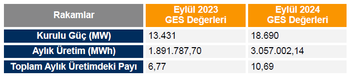 2023 Eylül ayında, 13.431 MW kurulu güç ile 1.891.787,7 MWh elektrik üretildi. 2024 Eylül ayı sonundaki verilere göre ise kurulu gücümüz 18.690 MW’a yükseldi ve 3.057.002,138 MWh elektrik üretildi.