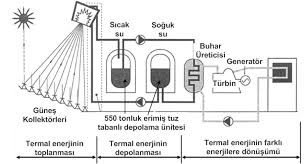 Yan tarafta ise Fransa’da yer alan Themis Santrali’nin şematiği gösterilmektedir. Bu santralde güneş ışınlarının termal enerjisi güneş kolektörü kullanılarak toplanmakta olup bu enerji erimiş tuz kullanılarak depolanmaktadır. Sistem gerektiğinde depolanan termal enerjiyi elektrik enerjisi formunda şebekeye aktarmaktadır.