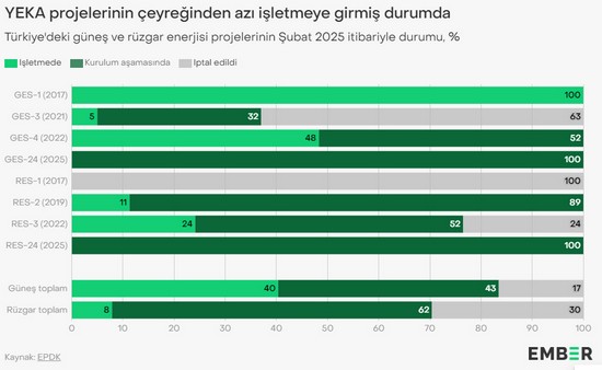 Güneş enerjisinde, ilk YEKA ihalesinin yapıldığı Mart 2017’den son ihalenin gerçekleştiği Şubat 2025 tarihi arasında toplam 3,8 GW’lık GES kapasitesi ihale edilmiştir. Bu kapasitenin 1,5 GW’ı üretime geçmiş, 1,6 GW’ı kurulum aşamasında ve 630 MW’ı iptal edilmiştir. Rüzgar enerjisinde ise toplam ihale edilen 4 GW kapasitenin 319 MW’ı hayata geçmiş, 2,5 GW’ı kurulum aşamasında ve 1,2 GW’ı iptal edilmiştir.