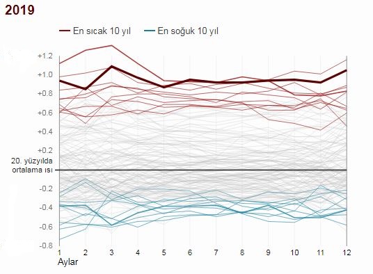 Yıllık sıcaklıkların 20. Yüzyıl ortalamasıyla karşılaştırılması
