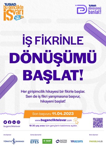 2011 yılından beri Türkiye’nin en kapsamlı erken aşama girişimcilik programı olan Bu Gençlikte İŞ Var!’ı düzenleyen TÜSİAD, benim fikrim iş yapar! diyen 18-30 yaş arası tüm gençleri ekiplerini kurup “Dönüşümü Başlat! İş Fikri Yarışması”na katılmaya davet ediyor. 11 Nisan 2023 tarihine kadar açık olacak yarışmada, bu yıl genel kategorinin yanı sıra afet kaynaklı sorunların çözümüne yönelik iş fikirleri ayrı bir başlık altında değerlendirilecek.