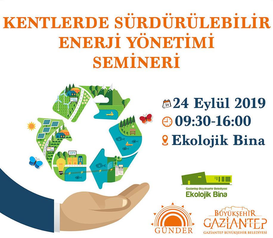 Gaziantep Büyükşehir Belediyesi ve GÜNDER işbirliği ile 24 Eylül 2019 tarihinde sürdürülebilir kentleşme için yenilenebilir enerji uygulamaları tanıtılarak konusunun uzmanı konukların yer aldığı seminerle sürdürülebilir kent olgusunun ne olduğu, nasıl ulaşılabileceği kentsel enerji ihtiyacının nelerden kaynaklandığı ve bunların yenilebilir enerji kaynakları ile nasıl karşılanabileceği ve kentsel enerji yatırımlarının nasıl finanse edilebileceği konuları masaya yatırıldı.