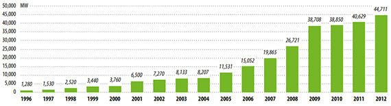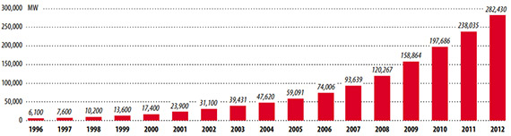 2012 yılında 13GW’lık yeni kapasite ile Çin ve ABD’nin lider olduğu, Almanya, İngiltere ve Hindistan’ın 2 GW’la takip ettiği yeni rüzgar türbini kurulumları sonrası, toplam küresel kapasite 45GW artarak 282 Gigawatt seviyesine ulaştı.
