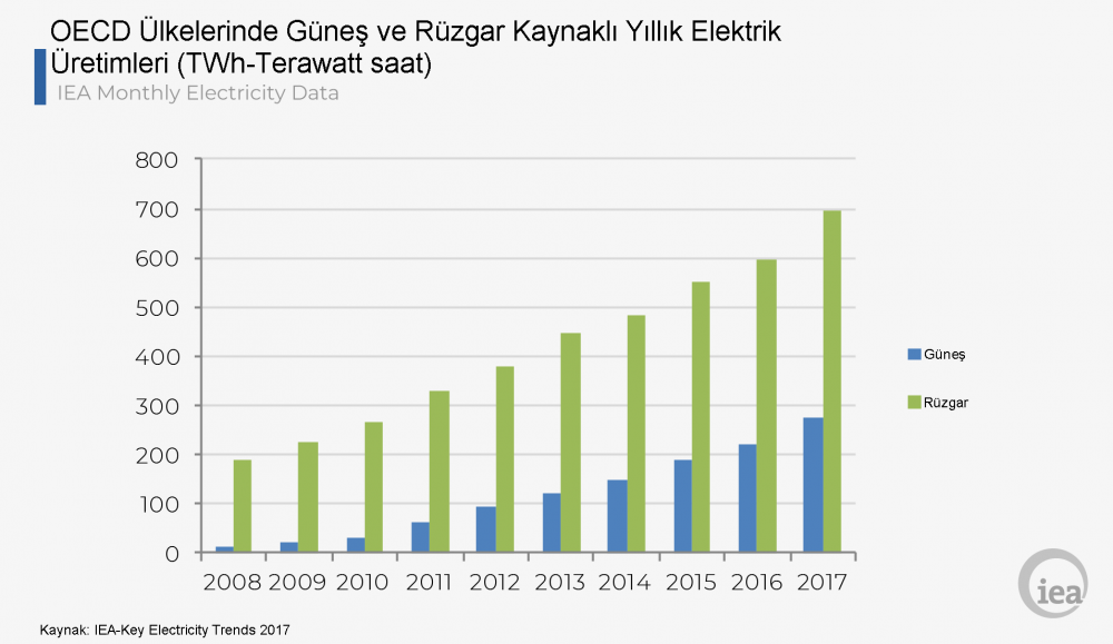 Jeotermal, güneş, rüzgar ve diğer yenilenebilir enerji kaynaklarından elde edilen OECD ülkelerindeki toplam üretim, 147.2 TWh’lik bir artış ile 2017 yılında 1030.3 TWh’ye yükseldi ve %16.7’lik bir artış gösterdi. Bu oran, son on yılda OECD ülkelerinde bu kategoride görülen en büyük artış. OECD Asya/Okyanusya ülkeleri %19.4 artış ile 17.1 TWh; OECD Avrupa %14.9’luk bir artış ile 64.3 TWh; OECD Amerika %18.2’lik artış ile 65.3 TWh ile en çok büyümenin görüldüğü ülkeler arasında yer aldı.
