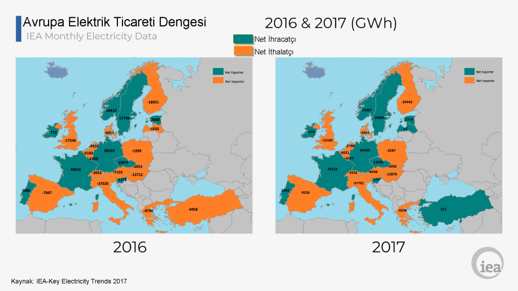 IEA’nın raporundaki toplam OECD elektrik ticareti, Avrupa ve Amerika kıtasındaki ticareti temsil ediyor. Amerika kıtasındaki elektrik ithalatı %2,6 oranında azalırken ihracat ise % 0,6 oranında artış gösterdi. Avrupa’da, 2017 yılında ihraç edilen elektrik %4,8 artışla 406,4 TWh’ye yükselirken elektrik ithalatı %0.9 artışla 399 TWh oldu. Almanya, bir kez daha Avrupa’nın en büyük elektrik ihracatçısı olurken Fransa, net ihracatçı olarak kaldı ve 39 TWh’nin üzerinde ihracat gerçekleştirdi. Fransa’nın 2015’ten bu yana düşük nükleer üretimi nedeniyle ihracat rakamlarının üçte iki oranında azaldığı belirtiliyor. Portekiz ve İrlanda, 2016 yılında elde edilen net ihracatçı statüsünü korurken İspanya, İsviçre ve Polonya daha fazla ithalata yönelen ülkeler oldu. İsveç ise elektrik ihracatında hidro ve nükleer toparlanma ile desteklenen ülkeler arasında yer aldı. Türkiye, elektrik üretiminin beşte birinden fazlasını karşılayan hidro kaynaklı elektrik üretiminde görülen düşüşe rağmen, 2010 yılından bu yana ilk kez 2017 yılında olumlu bir ticaret dengesine sahip oldu.