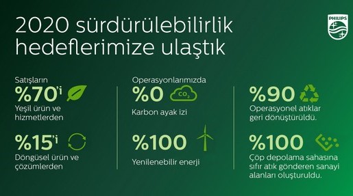 Royal Philips (NYSE: PHG, AEX: PHIA) Sağlık teknolojilerinde global bir lider olan Royal Philips, “Sağlıklı İnsan, Sürdürülebilir Gezegen 2016-2020” programında belirlediği tüm hedeflere başarıyla ulaştı. Programın ulaşılan en önemli hedefleri; operasyonlarda karbon nötr olma, elektriğin %100’ünü yenilenebilir kaynaklardan sağlama, satışların %70’ini yeşil ürün ve hizmetlerden, [1], %15’ini döngüsel ürün ve çözümlerden elde etme, operasyonel atıkların %90’ının geri dönüştürülmesi ve sıfır atık oluşturmadır.